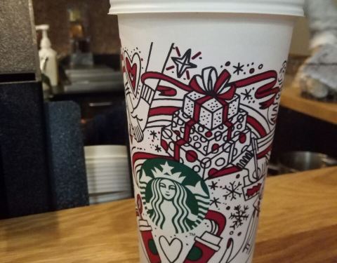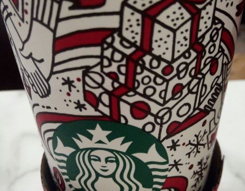 - 路过星巴克虹口龙之梦店,于是就打包了咖啡带回去。这次圣诞季的新款自然也不能错过,蛋糕很可爱