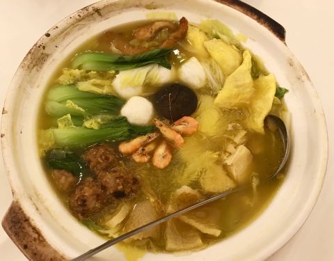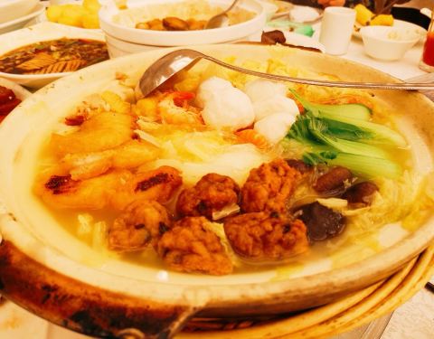 金时代顺风大酒店吴中路店,坐落在吴中路上近宋园路、桂林路口的“古北时尚”三楼。这里虽然不是地铁上盖,但公共交通和自驾停车都还方便,加上“顺风”多年来的金字招牌,生意一直很好。尤其是节假日,家人朋友同事选择在这里请客吃饭的特别多,得提前好多天预订。 这次12.31选择看一场好电影犒劳自己,地点就在顺风大酒店楼上的巨影国际影城,所以先来这里吃一顿快速的简化版年终大餐。两人胃口都不大,又赶时间,就点了他家法式焗蜗牛和全家福砂锅。因为这全家福砂锅内容丰富,熏鱼、大虾、肉丸、蛋饺、肉皮、粉丝、青菜心、娃娃菜,一大锅荤素全含,所以起了个“全家福”的吉利名儿。值此迎接2020年元旦来临之际,在顺风顺水的酒店,花五十分钟吃完了简化版“全家福”年终大餐,真有大吉大利迎新年的感觉了!