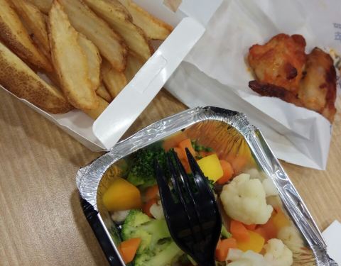 为了用掉免费的薯角和鸡翅,就近找了家达美乐买了份暖蔬。堂吃外卖包装是一样的,配了一包蕃茄酱给薯角和一包千岛酱给蔬菜。薯角边角脆脆的里面却是软软的,本身带点咸味,好吃。蔬菜很烫,量不大品种有五六种,但本身没调味。