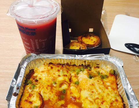 天气不好就点达美鲜,保证半小时内就能吃上了。披萨说不上多好吃,每次就选手上有折扣券的那款,牛肉披萨的肉挺多的,就是偏咸,幸好加了俩小甜点。8块两个的蛋挞从来不出钱买,我总有一大把免费券。这次新尝试了苹果酥,里面真的有苹果粒,味道还不错。