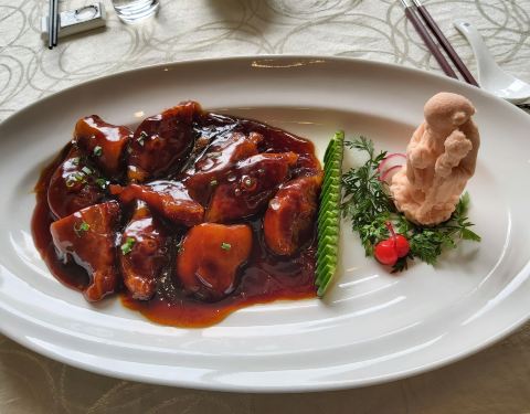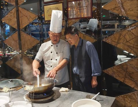 1、位于宝山区菊联路118号的高老庄绿色传奇酒家,有一道菜——红烧鮰鱼,是上海市40个非遗餐美食品牌之一。 2、2020年5月31日中午特地赶去宝山顾村,就是为了去品尝店家的这道红烧鮰鱼。今天恰逢第三代传人徐师傅最后一天掌勺,明天起休假十天,徐师傅不在,这道菜不卖的。 3、徐师傅知道我是特地来吃红烧鮰鱼的,他便推荐我再吃一道他秘制的鮰鱼狮子头。他说了,这个鮰鱼狮子头午市是不供应的,看到我如此钟爱徐师傅的红烧鮰鱼,所以,就拿出来两个红烧狮子头煮给我吃。 4、徐师傅烧红烧鮰鱼这道菜,需要一个小时,一个小时的过程中,徐师傅耐心地向我介绍红烧鮰鱼的烹饪知识,不断地向我传授这道菜的制作技能,可惜本人没出息听过算过,永远也学不会的。 5、就餐过程中,徐师傅特地走到我的餐桌来,并问我味道如何?看到我这位食客太精了,除了经典菜外,其它餐食什么也不点,包括蔬菜都不点,徐师傅返回后马上让服务员给我送来了一道素菜,真的有点不好意思了,不过还是老话说得好,面皮老老,肚皮饱饱。 6、徐师傅跟我说他烧的红烧鮰鱼,吃口甜收口咸,确实如此,吃到后面我便觉着有点咸,但是,再怎么觉着咸,整个下午并未觉着口干石燥,需要喝水。