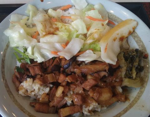 就在大润发楼下,外面一眼就能瞧到这家店,中午去的,生意很好,人很多,不过店面看去还是挺干净整洁的。点的得卤肉套餐,端上来的碗挺大,以为分量很多,实际发现碗很尖,底下少,所以实际分量不多,一开始可能因为饿,觉得味道很好,汤汁浇饭就能直接吃。后来吃多了就觉得一般。卷心菜不够熟,所以没吃。豆浆里面还有红豆之类,甜的,味道还可以。