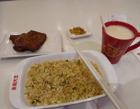 平价快餐店,味道一般,分量较少,上菜快,招牌豆浆必喝,店面卫生还行,推荐最近的猪排蛋炒饭。