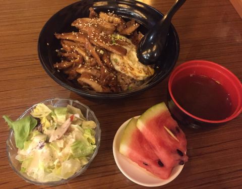 点了一份照烧鸡肉套餐,包含蔬菜色拉、鸡肉饭、味增汤、水果。色拉味道调的不错,酸酸辣甜,比较开胃