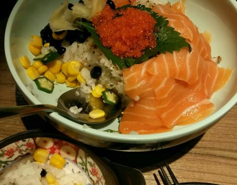 这家日式料理店,中午去的时候不用排队,座位上有微信扫码直接点单。 牛油果色拉非常爽口,很受欢迎。 肥牛寿喜锅,锅底蔬菜很多,不用另外再加素菜啦,肥牛肥瘦相间,味道不错。 三文鱼饭,米饭里面有姜片、秋葵、玉米粒和黑豆等,上面有鱼子及若干三文鱼片。