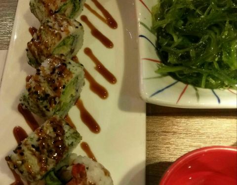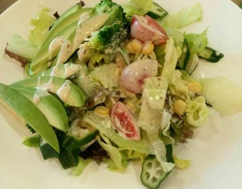 牛油果色拉非常爽口,很受欢迎。这家日式料理店,中午去的时候不用排队,座位上有微信扫码直接点单
