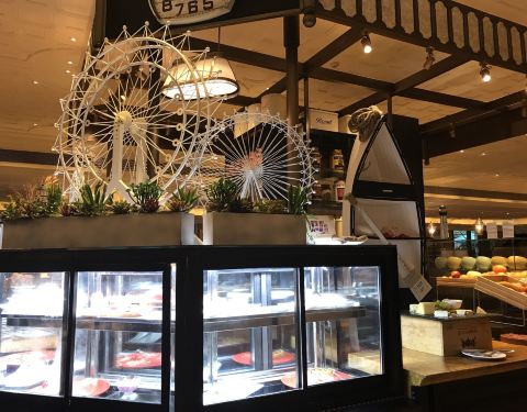 和小姐妹们约了带了小朋友过来吃自助午餐。门口没有保安,第一次来有点蒙圈,不知道地下车库在哪里……其实我们家不是很会吃自助餐,因为生的海鲜什么的都不吃,所以即使菜品看上去还算丰富,但是我们根本没怎么吃,所以也品不出个所以然来,我们纯粹是过来玩的,公园一样的环境很不错,拿了停车券可以免费停3小时。