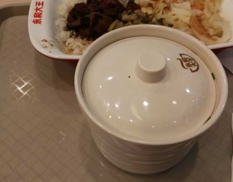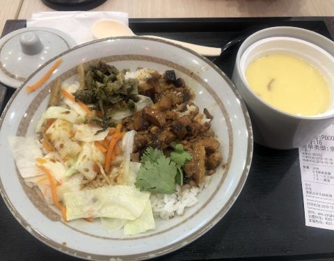 中午饭点的时候,搜到这里附近的永和大王团购套餐只有9.9,太划算了!下单! 套餐是一份卤肉饭加一份炖蛋,对一个女生来说量足够啦。店内生意很好,服务员也热情有理。上菜速度很快,落座没多久,电子器就响了。