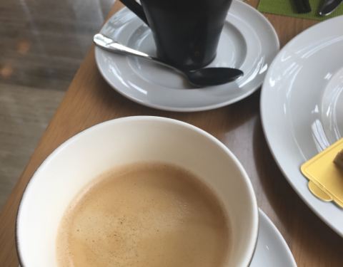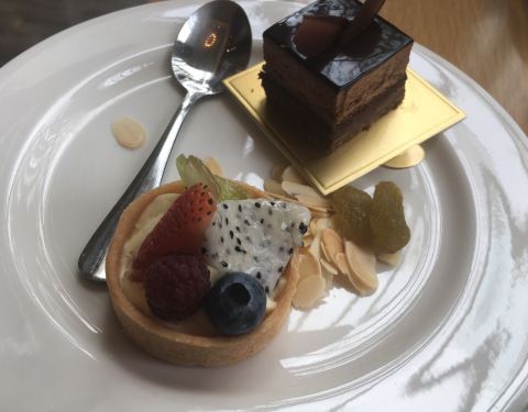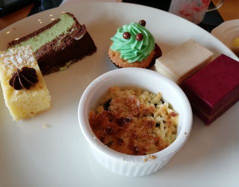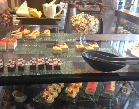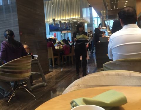 静安香格里拉的自助餐厅,1楼,有户外位。服务很好,领位,收空盘等等,服务表扬下。 餐食选择不多,座位之间也有点拥挤。咖啡和茶是免费的,选了拿铁和红茶。甜品类很多,有块巧克力蛋糕挺好吃的。奶油蛋白...