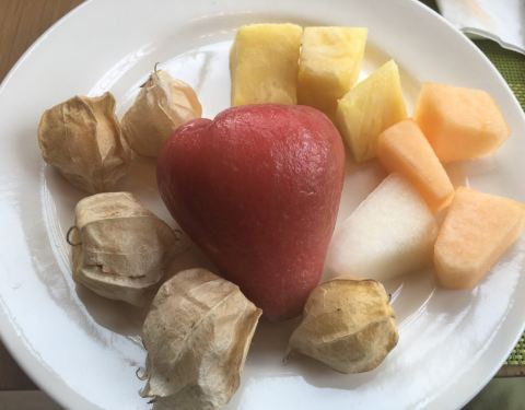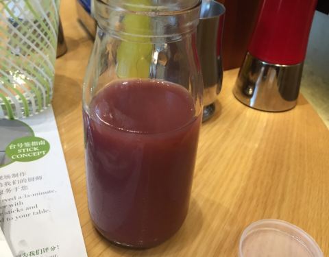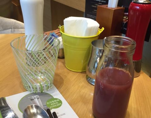 在这里吃的早餐,最晚可以到10点半,不错,吃饱了中午就不用再吃了,餐厅在一楼,长长的一条,品种还挺多的,很多鲜榨果汁放在有盖的玻璃瓶里,冰在冰箱中,有杨梅汁,这个比较少见的,进口水果也不少,中西结合...