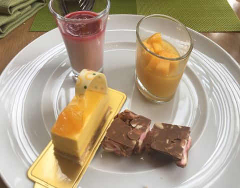 - 甜品类很多,有块巧克力蛋糕挺好吃的。还有凉粉,这个自助餐很少见。金枪鱼吃起来松散,不行