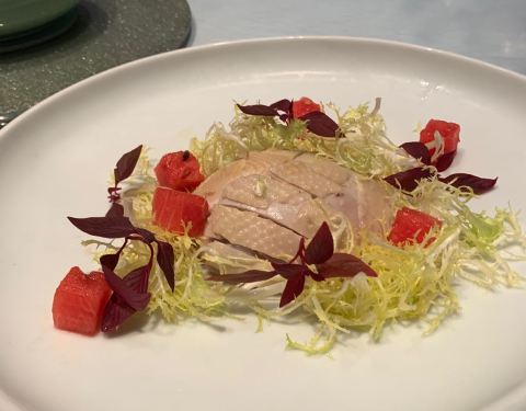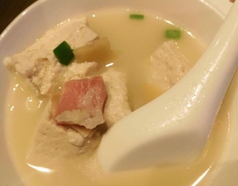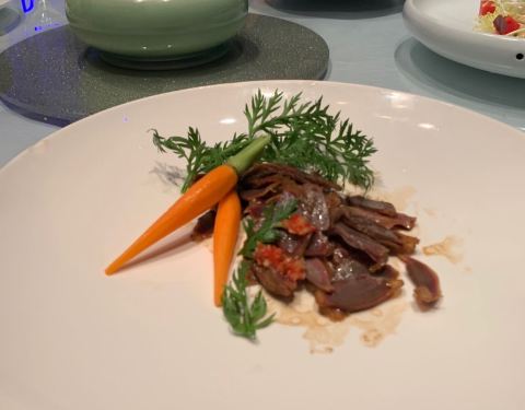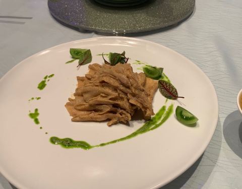 栗子白菜是除了烤鸭最最满意的一道菜,吃得很爽。宫保虾摆盘美观,看着就很有食欲,虾仁弹牙个头也不小,量还是比较足的,最后都没吃完。番茄脆菇沙拉本来以为是用樱桃小番茄做的,所以点了一例,其实是中等个头...栗子白菜是除了烤鸭最最满意的一道菜,吃得很爽。宫保虾摆盘美观,看着就很有食欲,虾仁弹牙个头也不小,量还是比较足的,最后都没吃完。番茄脆菇沙拉本来以为是用樱桃小番茄做的,所以点了一例,其实是中等个头的番茄,皮挺厚的那种,应当点单只尝尝鲜的就好了,味道不功不过。狮子头和老豆腐都还行,没有特别出彩的地方。托寿星公的福,免费赠送了一碗寿面,味道满好。寿星不喜鹅肝所以没点樱桃鹅肝,本来还点了江雪映小排,漏单了,不过也实在是撑不下东西所以没补,这两个留着下回来试吧。