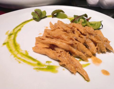 ...做的,所以点了一例,其实是中等个头的番茄,皮挺厚的那种,应当点单只尝尝鲜的就好了,味道不功不过