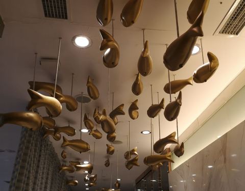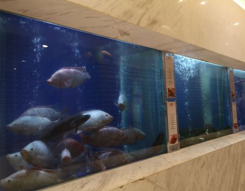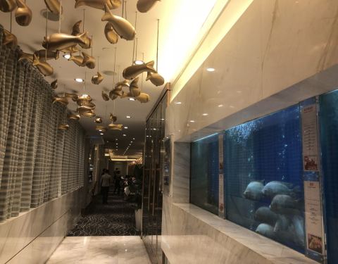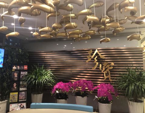 来这家吃饭,预约晚了,所以很可惜没有包房了~ [环境]进入餐厅,吊顶上都吊着金色的鱼,旁边是海鲜墙,挺特别的~ 大堂空间有点拥挤,而且客人多所以很嘈杂~ 海鲜很新鲜,但印象深刻的倒是前菜和甜品~ |芥末虾肉...
