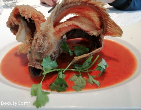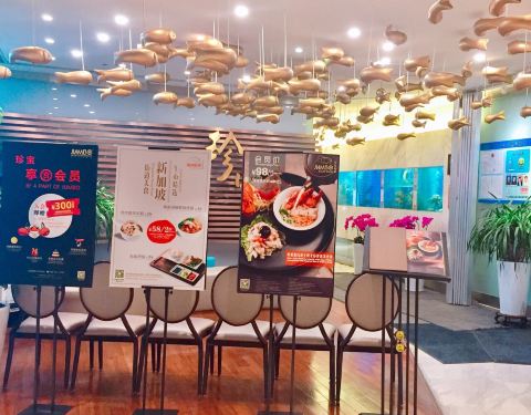 来这家吃饭,预约晚了,所以很可惜没有包房了~ [环境]进入餐厅,吊顶上都吊着金色的鱼,旁边是海鲜墙,挺特别的~ 大堂空间有点拥挤,而且客人多所以很嘈杂~ 海鲜很新鲜,但印象深刻的倒是前菜和甜品~ |芥末虾肉...来这家吃饭,预约晚了,所以很可惜没有包房了~ [环境]进入餐厅,吊顶上都吊着金色的鱼,旁边是海鲜墙,挺特别的~ 大堂空间有点拥挤,而且客人多所以很嘈杂~ 海鲜很新鲜,但印象深刻的倒是前菜和甜品~ |芥末虾肉色拉^虾肉配上淡淡的芥末味,倒也爽口好吃~ |炸榴莲配野莓^榴莲经过油炸烹饪后,外脆里湿外热里冰,很好吃~