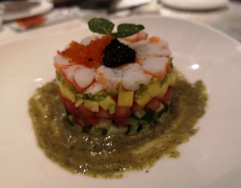 来这家吃饭,预约晚了,所以很可惜没有包房了~ [环境]进入餐厅,吊顶上都吊着金色的鱼,旁边是海鲜墙,挺特别的~ 大堂空间有点拥挤,而且客人多所以很嘈杂~ 海鲜很新鲜,但印象深刻的倒是前菜和甜品~ |芥末虾肉色拉^虾肉配上淡淡的芥末味,倒也爽口好吃~ |炸榴莲配野莓^榴莲经过油炸烹饪后,外脆里湿外热里冰,很好吃~