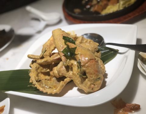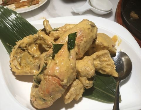 很久前就想来了,这次和朋友逛完街就来试试。据说是新加坡有名的螃蟹,那么既然新加坡去不了,就在这里解解馋吧。螃蟹肥美得很,还好每桌都放着吃蟹工具,不然那蟹钳真心咬不动。选了辣椒蟹,有汤汁,若配米饭应...很久前就想来了,这次和朋友逛完街就来试试。据说是新加坡有名的螃蟹,那么既然新加坡去不了,就在这里解解馋吧。螃蟹肥美得很,还好每桌都放着吃蟹工具,不然那蟹钳真心咬不动。选了辣椒蟹,有汤汁,若配米饭应该会很好吃,我看也有人会另外点刀切馒头配的。蒜香炸子鸡,味道也不错,香、嫩,配盐,但实际根本不需要。马来风光应该是拣过的,一点不老。整顿下来菜的口味偏重,吃后有点口干。