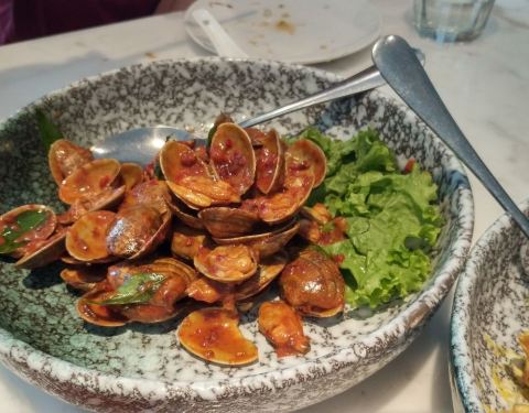 很久前就想来了,这次和朋友逛完街就来试试。据说是新加坡有名的螃蟹,那么既然新加坡去不了,就在这里解解馋吧。螃蟹肥美得很,还好每桌都放着吃蟹工具,不然那蟹钳真心咬不动。选了辣椒蟹,有汤汁,若配米饭应该会很好吃,我看也有人会另外点刀切馒头配的。蒜香炸子鸡,味道也不错,香、嫩,配盐,但实际根本不需要。马来风光应该是拣过的,一点不老。整顿下来菜的口味偏重,吃后有点口干。