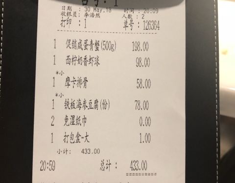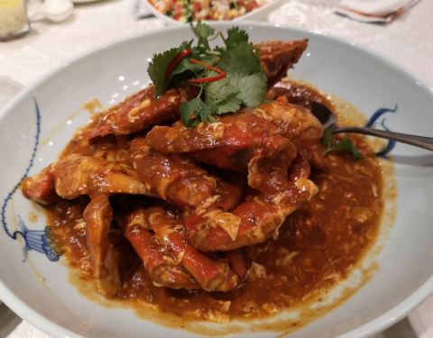 很久前就想来了,这次和朋友逛完街就来试试。据说是新加坡有名的螃蟹,那么既然新加坡去不了,就在这里解解馋吧。螃蟹肥美得很,还好每桌都放着吃蟹工具,不然那蟹钳真心咬不动。选了辣椒蟹,有汤汁,若配米饭应...