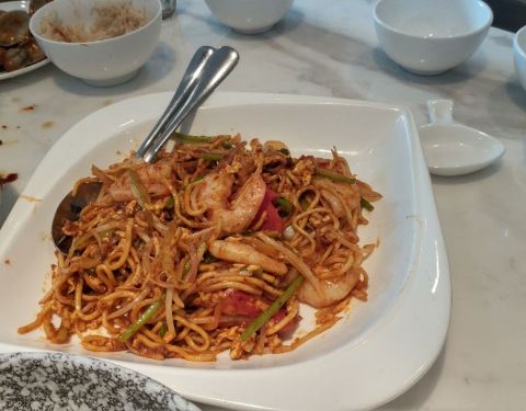 他家是DP榜上的必吃餐厅,小伙伴说中午有团购套餐,就约了午饭。还好去的早,不用等位。 餐厅环境不错,58元的午市套餐性价比还是蛮高的。 【蟹肉拌面】面真的超细,酱料有点辣,量正好。 【飞饼】一份2个,很脆。蘸咖喱土豆的酱一起吃绝配。 【咖喱鸡块土豆】鸡腿要自己撕,不辣,味道不错。