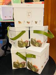 一盒六颗粽子,每种口味两颗,速冻可以保存4个月。速冻熟粽拆袋后,加热,拆线去叶,就可以食用了。