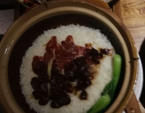 将肉香四溢的“双腊煲仔饭”的精髓紧紧包裹,内含荣华腊肉、腊肠、鸭肝肠、流沙咸蛋黄和香菇。腊肠有酒糟的味道但不太好吃,还有腊肉,有点甜。糯米不错。
