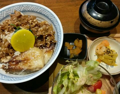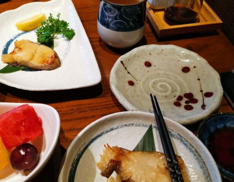 静安寺芮欧楼上的日式料理,中午有套餐,性价比蛮高的,经常去吃。 他家中午定食选择多样,最喜欢肥牛加鳕鱼套餐,量很多,肥牛,鳕鱼两种食材,丰富,配菜有蔬菜色拉与水果,吃下来不错,营养搭配,蛮好的。