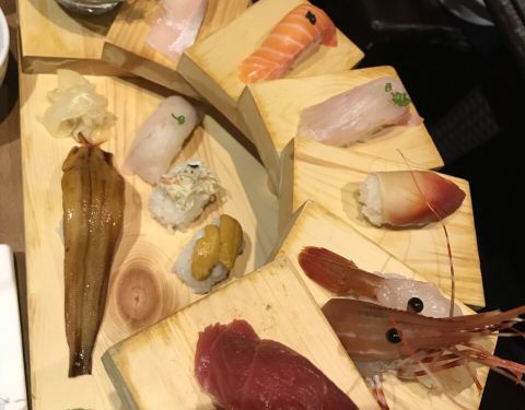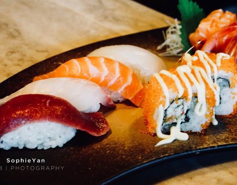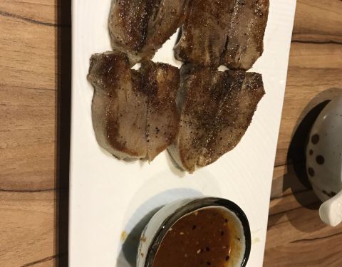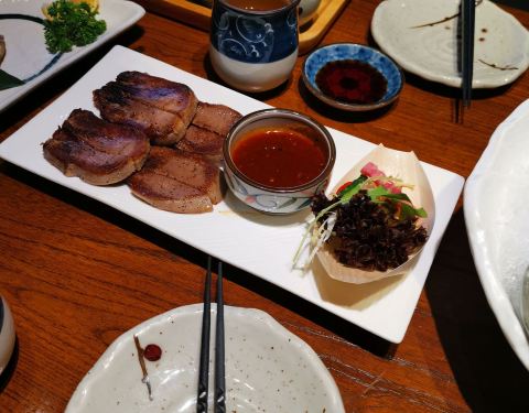 之前有几次想过来吃但都要排队,无奈去了隔壁的极食。某个星期二晚上六点半左右过来倒是没有人闹。环境还算蛮舒服的,座位不算太挤太局促。我不喜欢脱鞋的榻榻米位置,还好靠窗有正常座位。两个人的桌子有点小,菜稍点多了就放不下,要加快进食速度。烧烤厚牛舌看到许多人推荐,可是上来时闻到那股牛膻味我就有点想呕了,个人不喜欢,吃了一口就不想再吃第二口了。三文鱼鳍炒饭有点惊喜,非常好吃,加入的鱼籽也是又新鲜又爽口。十握寿司拼盆也还不错,基本一圈下来胃就撑了,最后几个是只吃上面不吃下面的饭了。三文鱼腩刺身很新鲜,烟熏的加鹅肝也算比较创意的,搭配芒果酱入口也不腻。总体而言除了牛舌其他还行,下次来试点别的,当然前提还是不等位的情况下。