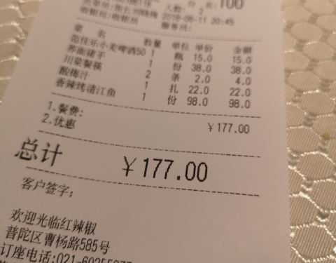 昨天晚上去吃的,这家店离曹杨路地铁站很近交通很方便,店内环境也可以,服务员会先问你吃炒菜还是火锅然后再安排位置,昨天吃的是炒菜,每个菜都会贴标注明是哪个厨师烧的,吃下来一个时蔬味道不错很爽口,另外烤鱼也不错菜很入味,比较一般的是一个辣子鸡,里面的鸡块有些杂七杂八,另外鱼香肉丝也很普通,总体吃下来中规中矩,没有眼前一亮的菜品