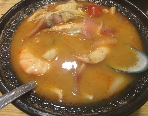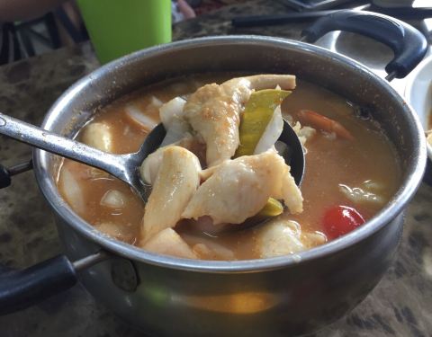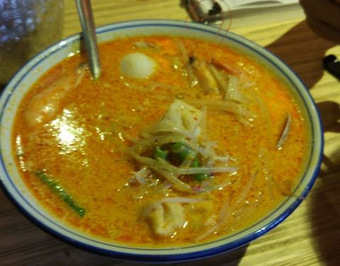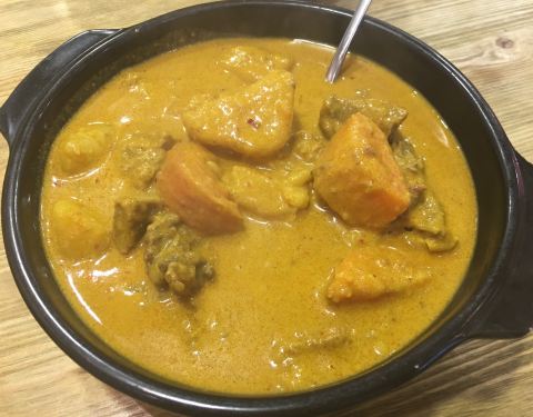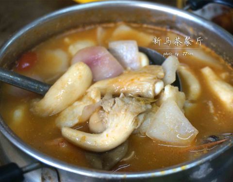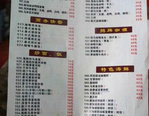 在附近办事 吃饭时间发现有家东南亚餐厅 离得不远就过来试试 在公兴路上 门面不大 也就十来张桌子 环境就是街边茶餐厅 新马海南滑鸡 很普通的鸡 没吃出什么特色 鸡倒是挺大 咖喱牛腩 招牌菜之一 一般般 感觉端上来的锅都没擦干净 冬阴功汤 也是招牌菜 不过和宣传画相距甚远 料很少 味道普通没记住 西蓝花炒素 中规中矩吧 没明白如何为什么吃的人还挺多的 很一般