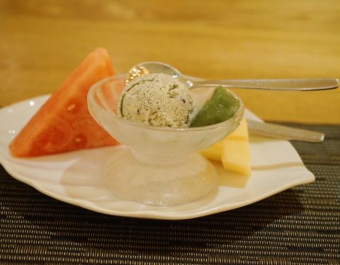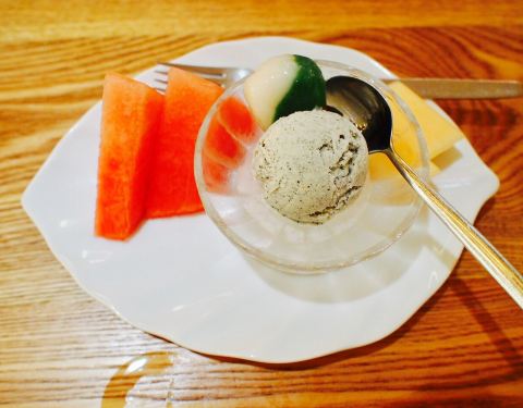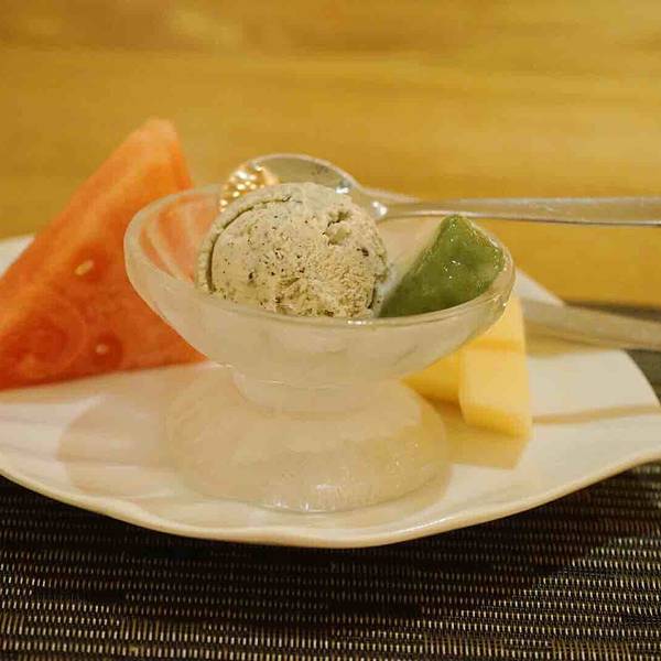 天妇罗配的明虾杏仁和大叶扇贝,拌过萝卜泥的酱汁蘸着吃,不会很油腻。主食是清汤荞麦面,前面因为会比较油一点,这就比较清淡了,过渡很好。最后是甜品,阴阳米糕,一白,一绿,糯米做的团子吃口很弹,没有甜味,是因为更好的衬托芝麻味的冰淇淋。还搭配了季节性水果哈密瓜和西瓜若干。