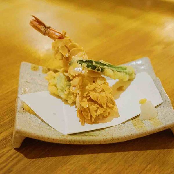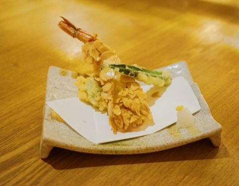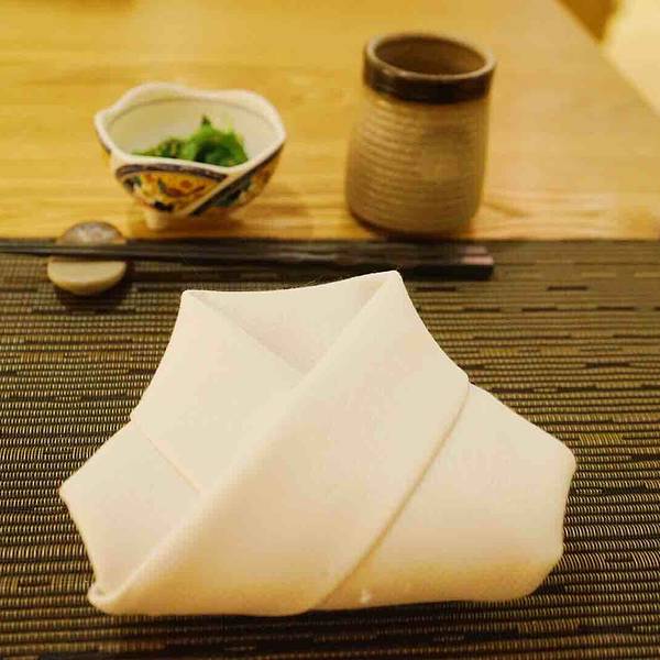 宝华万豪2层的日料餐厅。环境是日式简约风。原木和简单的灯影效果。还有和风玩偶做摆台装饰。 有大堂位也有包厢。注重私密感。餐巾别出心裁的折叠成和服的造型。 竹,8道式套膳。 前菜 清爽的海藻清口开胃。 刺身 刺身三品:三文鱼、北极贝、甜虾。刺身的口感鲜嫩甜美。 汤 海鲜土瓶蒸 初冬的夜晚,喝上一壶土瓶蒸,暖胃又暖心。 烧物 三文鱼洋葱卷 牛肉金针菇卷 烧物看似简单,却很考验厨师功力。 煮物 猪肉角煮。猪肉保持了原有的鲜嫩口感又很入味。 天妇罗 紫苏扇贝天妇罗 明虾杏仁天妇罗 整晚最惊艳的就是这道天妇罗了。明虾外包裹着喷香酥脆的杏仁。坚果香、海鲜味,两者相得益彰。 紫苏叶的独特清香与扇贝的弹牙嫩滑,让天妇罗的美味加成。 主食 清汤荞麦面 吃到这里,作为主食的荞麦面反而是清爽的口感更讨人喜欢。 甜品 阴阳米糕配芝麻冰淇淋、水果 阴阳米糕Q弹有嚼劲,芝麻冰淇淋吃得到芝麻的颗粒感,甜而不腻。刚好作为一餐的完美收尾。