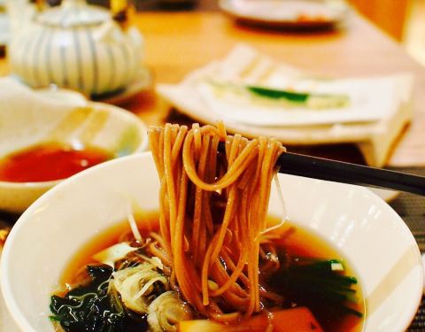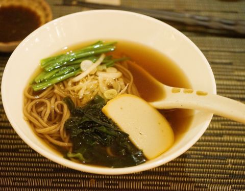 天妇罗配的明虾杏仁和大叶扇贝,拌过萝卜泥的酱汁蘸着吃,不会很油腻。主食是清汤荞麦面,前面因为会比较油一点,这就比较清淡了,过渡很好。最后是甜品,阴阳米糕,一白,一绿,糯米做的团子吃口很弹,没有甜味...