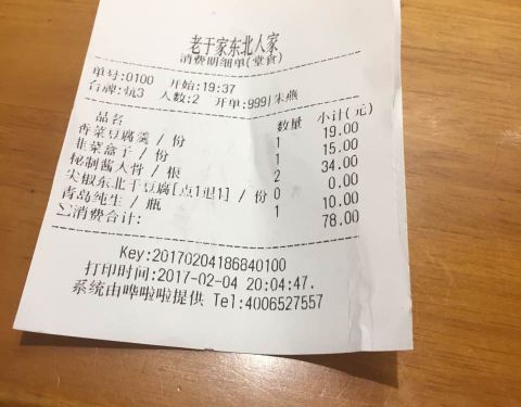 ...务员买单,单子上一看,有酒在内,地三鲜没有,晕死,付款走人,菜味道不错,但这服务真是没心没肺的