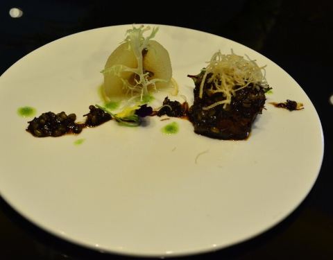 宫廷八宝鸭:豌豆、火腿、 虾仁、 冬笋、香菇、糯米、玉米、胡萝卜等等酌料,鸭肉已然酥烂,一勺入口,层级感强烈,腴香浓溢 阿拉斯加帝王蟹腿配牛油果酥皮:光看样子以为是个牛油果色拉 原来里面暗藏了阿拉斯加帝王蟹腿 正确吃法是滴管滴入红醋汁 舀一勺牛油果蟹腿肉放在酥皮之上 一起入口 感受美妙 熬香乳鸽:金蝉丝上卧、做鬼也风流 本以稀松物、实属珍馐馔 香酥已入骨、秘制难探求