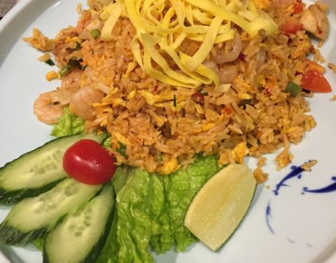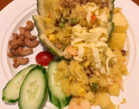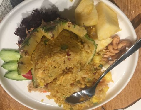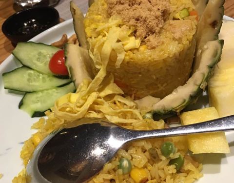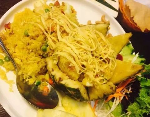 - ...处都是泰式风格的装饰,佛系风格,虾饼小小两个,虽然量少,但也足够了,菠萝炒饭很有趣,造型很好玩