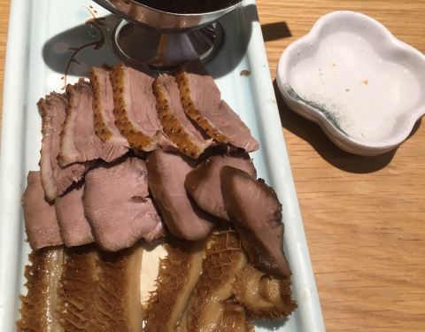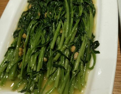好久没喝到广东的粥了,特意选了这家店。广东人喜欢夜宵或者早茶喝粥,我们只有晚餐有时间。 点了招牌的鲍鱼干贝基围虾粥,另外配了卤虾、卤鹅和春菜。 熬粥需要点时间,粥煲得确实不错,里面的料也不少,确实很鲜。 卤虾有点和上海的糟虾差不多,但是汁不一样,入口时没有那么冲,但是味道不是很鲜,但是吃到虾肉后回甘很甜。 卤鹅的鹅肉还是很嫩的,调的卤汁也不是那种重口味的,清淡但又不失鹅的本味,就是刀功稍差,好多都没切断。 春菜是第一次吃,用豆酱烧,单吃豆酱太咸了,两者一起烧,刚刚好,菜也很嫩。