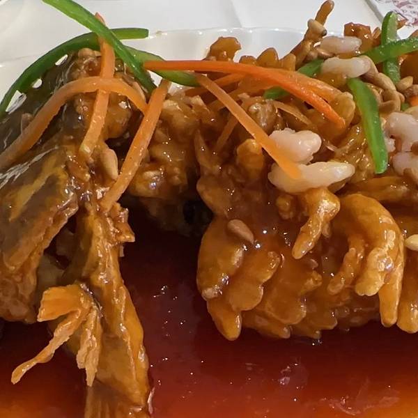 大家庭团聚南伶走一个~ 对南伶比较熟悉从岳阳路京剧院吃到了嘉里中心。喜欢他家的本帮菜和淮扬菜的融合风味,顾客的选择性会更大。 点了老上海熏鲳鱼,油爆河虾,葵花斩肉,扬州干丝,南伶烤鸭,红烧肉酱蛋,拆烩鱼头,上汤豆苗。香茜皮蛋黄鱼羹和豆沙锅饼。 今天最受欢迎的是熏鱼,烤鸭,油爆虾和葵花斩肉。熏鱼用鲳鱼做,比青鱼刺少,而且没有鱼腥气,鲜甜的口感,边上也能吃下不用吐刺,很赞! 葵花斩肉:就是黄芽菜炖蟹粉狮子头,狮子头嫩而不烂,肥而不腻,黄芽菜特别鲜美,汤汁好鲜,大受欢迎~ 烤鸭:南伶的片皮鸭包饼我很喜欢,鸭子不肥很香,一丁点不膻。 油爆河虾:本帮味道的鲜甜的油爆虾,河虾做的,比基围虾好吃很多,肉是活的,外壳酥脆,吸透了酱汁,特别上海,喜欢! 上汤豆苗:感觉比清炒的更嫩,当然也更清淡,几乎没油水,我蛮喜欢~ 拆烩鱼头:选的红汤烧法,因为大多数人不会吃辣,所以就关照了不要放辣,这个菜本身应该是有一点辣味才更入味更好吃。鱼头本身的选材非常新鲜,鱼肉吃起来几乎没刺,对我这种不会吃鱼的非常友好~ 红烧肉酱蛋和扬州干丝,个人觉得普普通通,无功过,不推荐! 黄鱼羹:个人很喜欢,因为今天请的都是长辈,不能吃太油的大汤,所以选了皮蛋黄鱼做主材的汤。