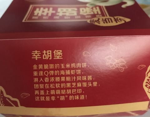 这是2018年抽中的第一个霸王餐,要说汉堡包,就喜欢吃“麦当劳”,套餐包括一个汉堡包,一包薯条,一杯可乐,一个人足够吃饱。汉堡包是新出的“幸胡堡”,应该是配合电影“捉妖记2”推出的新品,两片黑芝麻馒头片...这是2018年抽中的第一个霸王餐,要说汉堡包,就喜欢吃“麦当劳”,套餐包括一个汉堡包,一包薯条,一杯可乐,一个人足够吃饱。汉堡包是新出的“幸胡堡”,应该是配合电影“捉妖记2”推出的新品,两片黑芝麻馒头片,夹了一片鸡肉饼和一片虾饼,加入腰果鲍汁酱,鸡肉和虾结合,吃起来口味也点不搭,还是喜欢经典“麦辣鸡腿汉堡”和“麦辣鸡翅”,每次去必点