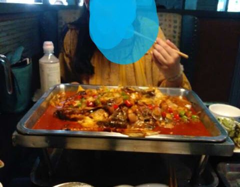 烤的罗非鱼,鱼的肉很厚,鱼刺很少,就餐环境还不错,点的蒜香的,太辣的吃不来,蒜香是微辣的,也挺不错,烤鱼上有一些洋葱和蘑菇,点的豆腐,不过不是外面卖的那种,豆腐有劲道的,额,吃不太习惯,羊肉串挺嫩...