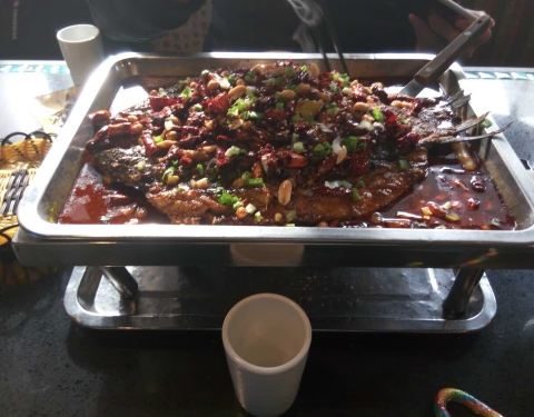 烤的罗非鱼,鱼的肉很厚,鱼刺很少,就餐环境还不错,点的蒜香的,太辣的吃不来,蒜香是微辣的,也挺不错,烤鱼上有一些洋葱和蘑菇,点的豆腐,不过不是外面卖的那种,豆腐有劲道的,额,吃不太习惯,羊肉串挺嫩的,味道还可以吧