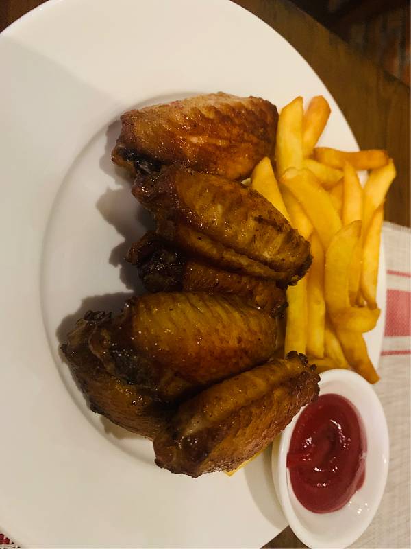 在青岛准备换个口味,于是选择了这家酒店门口的德国餐吧。本来是奔着烤猪肘去的,但是因为餐厅11点才开业,我们中午去的时候猪肘还没有准备好,因此就选了柏斯图肉肠汇,也就是香肠拼盘,外加半打鸡翅和一份凉菜。等菜的时候店家上了餐前面包,并提供了黄油肝酱,让我们垫一下。等餐的时间略长,好在上来的都很合胃口。柏斯图肉肠汇里有几种香肠,表层烤得焦脆,里面却很鲜嫩,而且一点儿也不油,配上酸菜和黄芥末酱,起到调味解腻的作用。鸡翅火候正好,个大肉嫩。 店里装潢也很有德国风,中间的开放吧台,欧式的木制桌椅,围着一圈的德国国旗和酒瓶装饰,正映衬了德国啤酒的特色风。下次再有机会准备晚上来,品尝一下它家的烤猪肘。