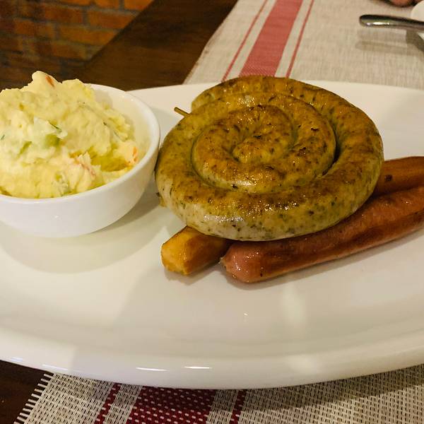 在青岛准备换个口味,于是选择了这家酒店门口的德国餐吧。本来是奔着烤猪肘去的,但是因为餐厅11点才开业,我们中午去的时候猪肘还没有准备好,因此就选了柏斯图肉肠汇,也就是香肠拼盘,外加半打鸡翅和一份凉菜...在青岛准备换个口味,于是选择了这家酒店门口的德国餐吧。本来是奔着烤猪肘去的,但是因为餐厅11点才开业,我们中午去的时候猪肘还没有准备好,因此就选了柏斯图肉肠汇,也就是香肠拼盘,外加半打鸡翅和一份凉菜。等菜的时候店家上了餐前面包,并提供了黄油肝酱,让我们垫一下。等餐的时间略长,好在上来的都很合胃口。柏斯图肉肠汇里有几种香肠,表层烤得焦脆,里面却很鲜嫩,而且一点儿也不油,配上酸菜和黄芥末酱,起到调味解腻的作用。鸡翅火候正好,个大肉嫩。
