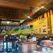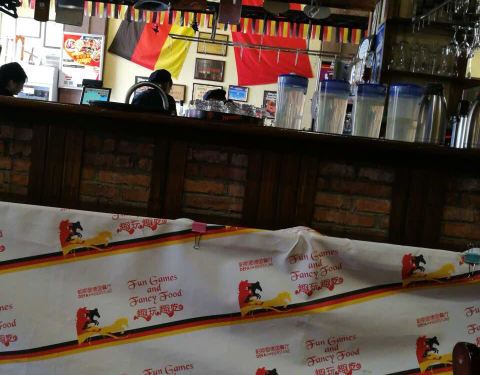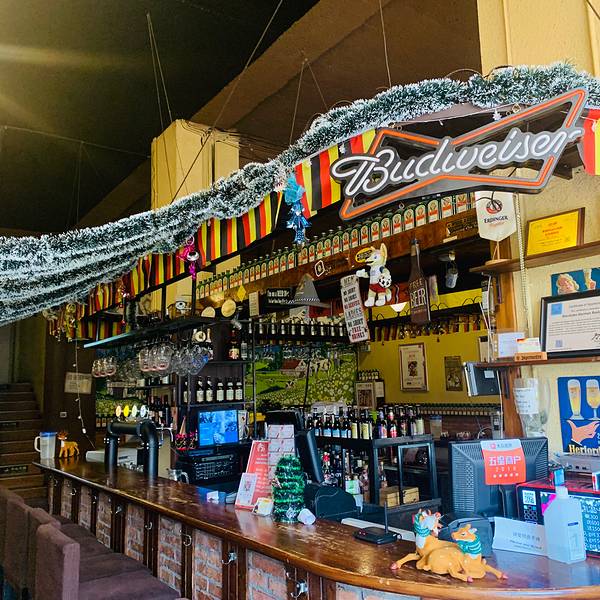 店里装潢也很有德国风,中间的开放吧台,欧式的木制桌椅,围着一圈的德国国旗和酒瓶装饰,正映衬了德国啤酒的特色风。下次再有机会准备晚上来,品尝一下它家的烤猪肘。