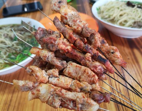 小烤肉2元一串,油水挺大,但是味道不错。就是普通街边馆的装修,看起来有点脏脏的,总体还能接受