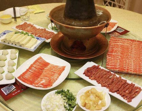 【口味】切出的肉片更以薄、匀、齐、美著称,半公斤羊肉可切二十厘米长八厘米宽的肉片80到100片,每片仅重4.5克,且片片对折,纹理清晰,“薄如纸、匀如晶、齐如线、美如花”,投入海米口蘑汤中一涮即熟,吃起来又香又嫩,不膻不腻。佐料包括芝麻酱、绍酒、酱豆腐、腌韭菜花、卤虾油、酱油、辣椒油及葱花、香菜等,集香、咸、辣、卤、糟、鲜等多种口味为一体,再加上自制的白皮糖蒜和芝麻烧饼,吃起来醇香味厚,口感独特。