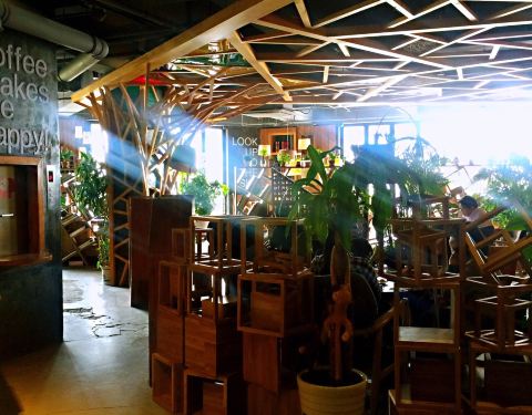 这家店有三层 电梯送餐 座位充足 生意红火 顾客爆满 装修不错 有我喜欢的木质感和冷色调 比较偏韩范儿 当然店里韩国顾客也不在少数 送顾客的超级迷你咖啡豆小蛋糕 造型和口感都是Q弹的 类似香港鸡蛋仔 榴莲千层果...这家店有三层 电梯送餐 座位充足 生意红火 顾客爆满 装修不错 有我喜欢的木质感和冷色调 比较偏韩范儿 当然店里韩国顾客也不在少数 送顾客的超级迷你咖啡豆小蛋糕 造型和口感都是Q弹的 类似香港鸡蛋仔 榴莲千层果肉不少 咖啡有点好喝 聊天环境比较舒适