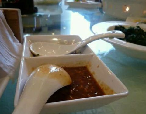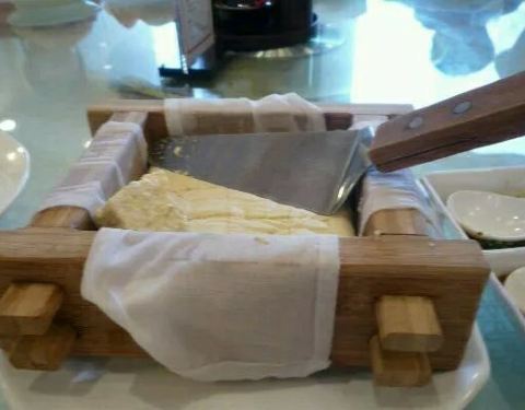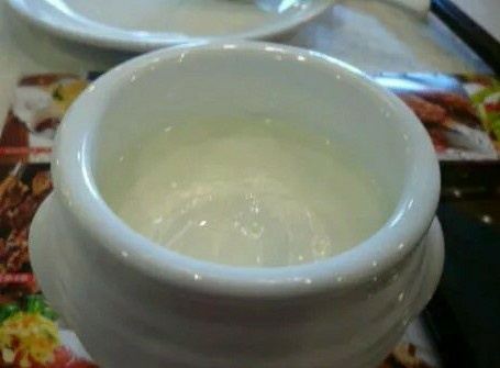 【口味】:自制石磨豆腐,这个作法感觉很像陕北老豆腐的做法!也是一个小方笼,然后配上调料供选择。其实笔者觉得这个豆腐还是蛮好吃的,不用蘸料也可以。还有一个汤!放在洋瓷缸子里,怀旧。