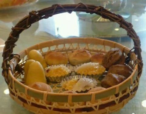 【口味】有装在篮子里的小点!篮子可爱,里面有玉米面窝窝头,还有核桃造型面点,还有其他等等!选了一个两种米做的心型小点,中间点红!好看好吃!