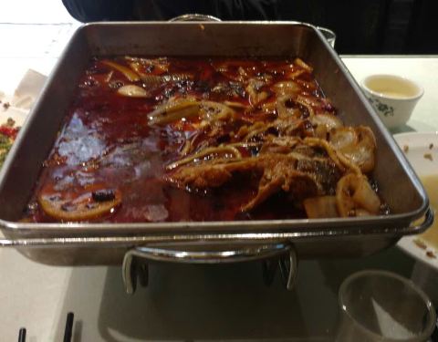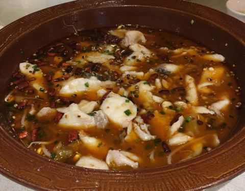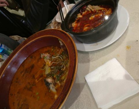 ...很大一盆,鱼片吃起来很新鲜,香香辣辣的,特别喜欢花椒的香味,配菜海带,酸萝卜,油渣小白菜很清爽